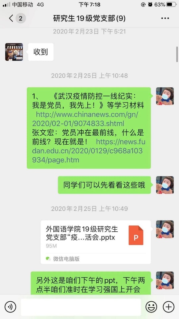 部分研究生党员在党员大会上积极分享了科学防疫、在线学习、潜心科研等内容,更有党员同志分享了参与线上公益家教,为最美逆行者子女开展志愿服务,还有积极投身社区和乡村防疫工作经历,用实际行动践行“一名党员就是一面旗帜”的精神。