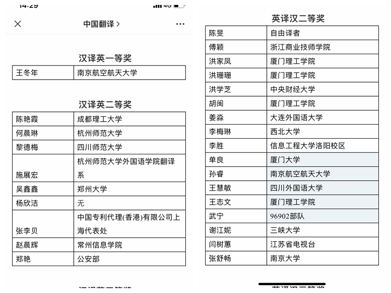 近日,在中国译协《中国翻译》编辑部与四川外国语大学联合举办的第三十二届韩素音国际翻译大赛中,亚洲色情 两研究生同学从全球一万八千多名译者中脱颖而出,斩获佳绩。其中,王冬年同学获得汉译英项目唯一的一等奖,孙睿同学获得英译汉项目二等奖,这是亚洲色情 学生自参加该赛事以来取得的最高奖项。