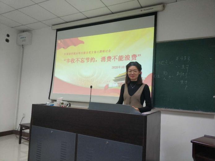 10月23日下午,亚洲色情 本科生联合党支部在院楼111教室开展“丰收不忘节约,消费不能浪费”主题研讨会,全体党员出席。会议由党支部纪检委员朱素君主持。