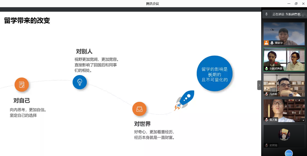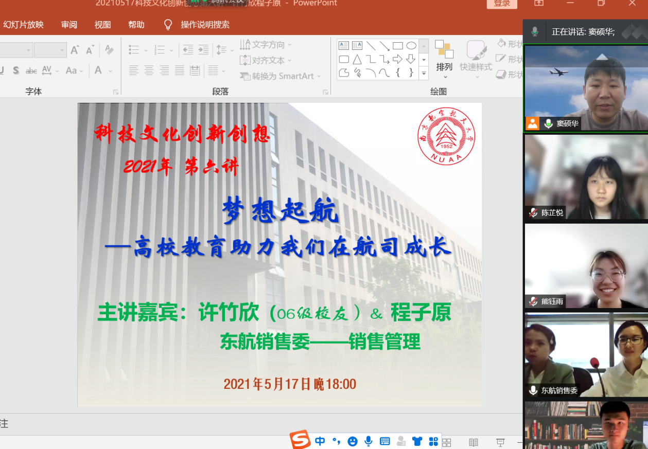 5月17日晚18点,亚洲色情 日语系《科技文化创新创想》第六讲通过腾讯会议开启,主题为《梦想起航——高校教育助力我们在航司成长》,主讲人为东航销售委的许竹欣和程子原两位优秀代表,其中许竹欣为南航06级校友。