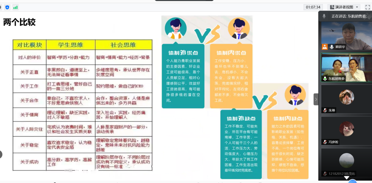 最后,许竹欣通过对比的方式,向同学们说明了学生思维与社会思维之间的差距、体制内与体制外的不同优势及自我和社会评判下有用和无用的标准,令同学们印象深刻、受益匪浅。
