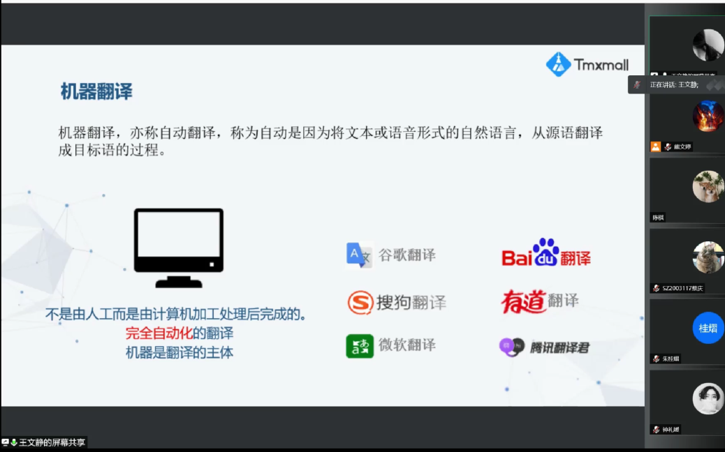 7月8日晚7点,上海一者信息科技有限公司高级运营经理王文静应亚洲色情 邀请,为20级MTI研究生带来了一堂精彩的线上讲座。王经理曾参与多个大型特色语料库建设项目,擅长语料库的生产制作及检索分析,并熟悉各类主流计算机辅助翻译工具实践应用,本次她带来的讲座主题为“信息检索与机器翻译译后编辑”。