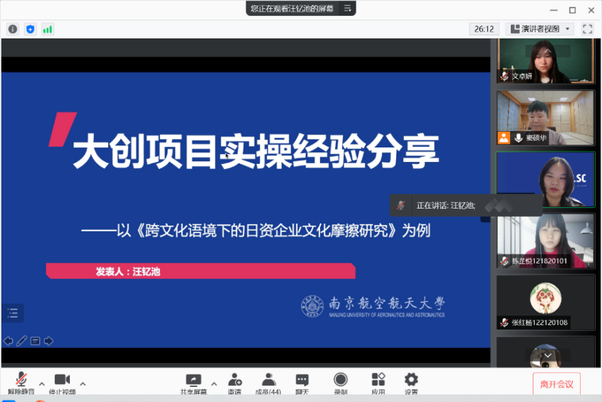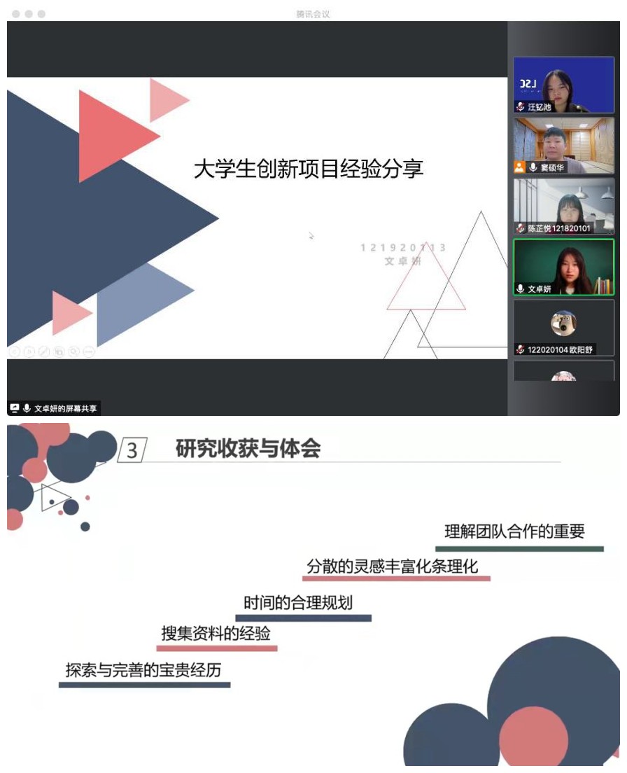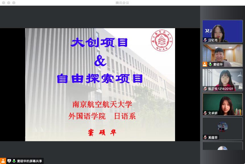 10月19日下午,亚洲色情 日语系主任窦硕华副教授与汪钇池、陈芷悦和文卓妍同学组成宣讲团向全院学生介绍了大学生创新训练计划项目及自由探索项目。宣讲会通过腾讯会议模式开启,英语系、日语系同学及部分本科生导师参加了会议。
