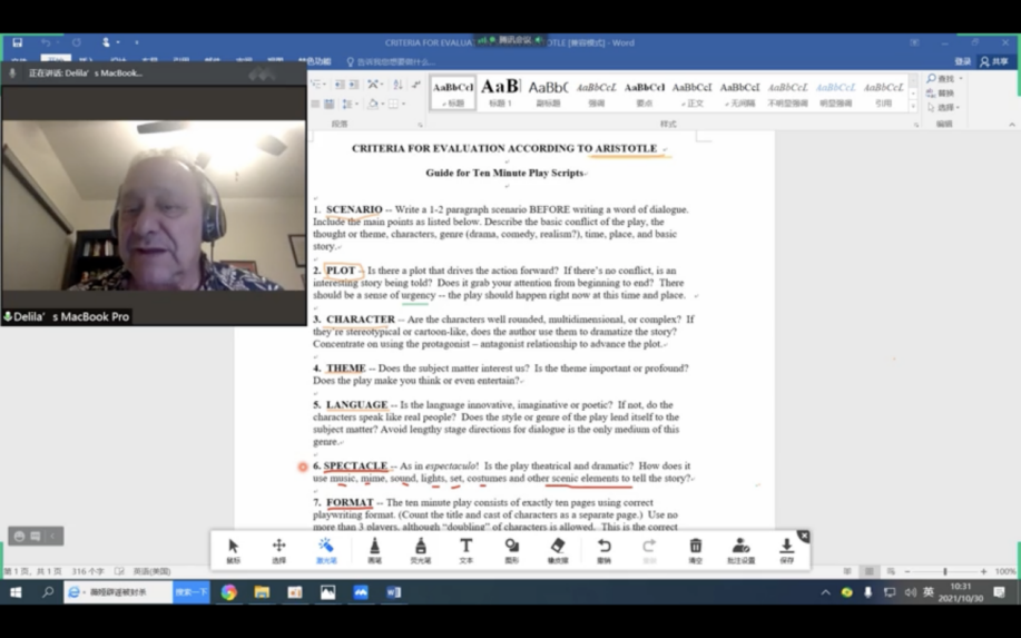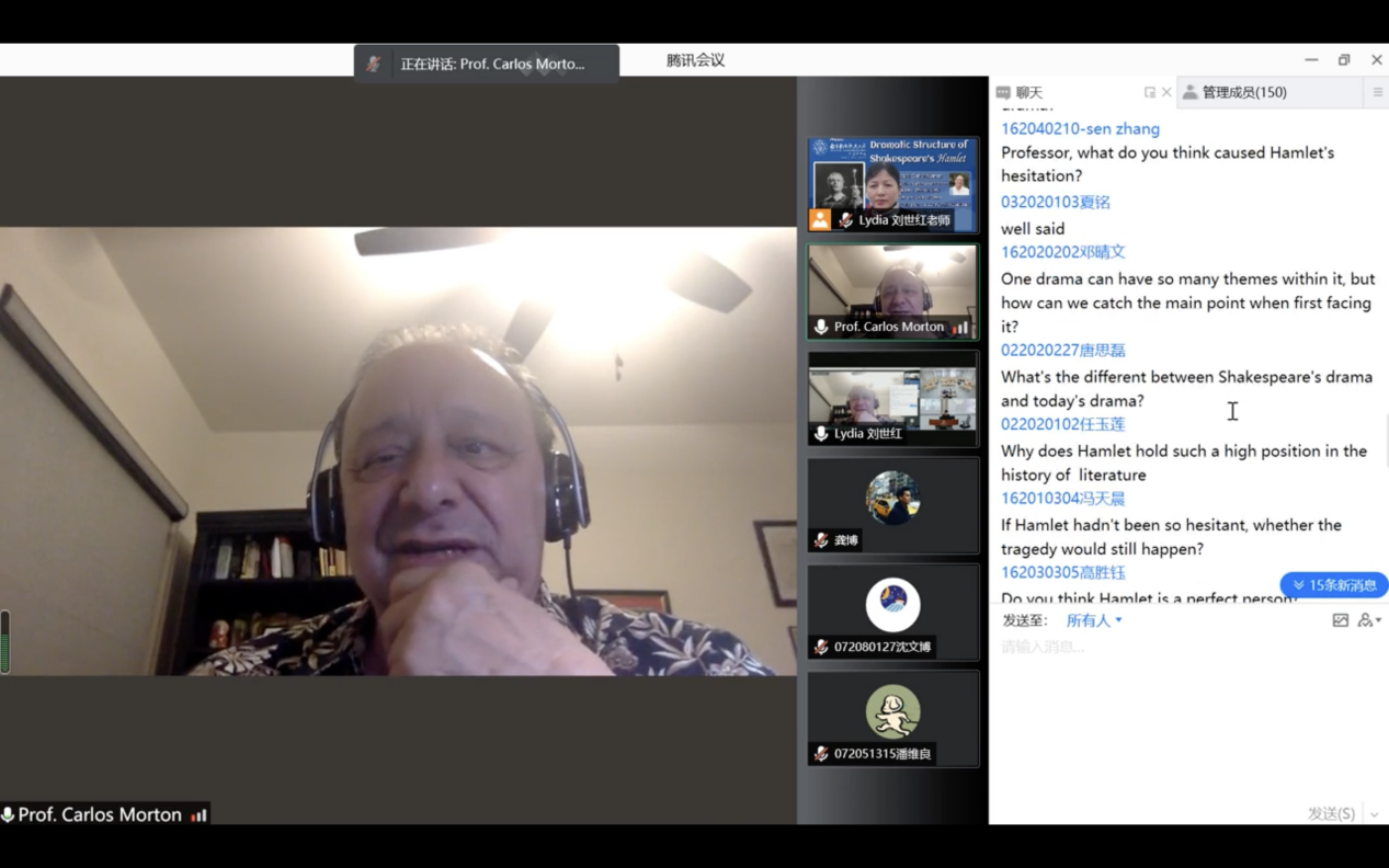 讲座由亚洲色情 国际联络中心主任刘世红副教授主持,共分为三个环节。第一环节为电影赏析,刘世红播放并分析1948年经典版的哈姆雷特电影的重点片段,让大家对作品情节有更多的了解。第二个环节中,Carlos Morton教授结合《哈姆雷特》为大家介绍了主角、情节、反面角色、事件、矛盾冲突、高潮等戏剧要素,随后又为大家讲解了基于亚里士多德戏剧理论的对于戏剧的评价标准。第三个环节为教授与学生的互动环节,同学们在软件聊天室或者开麦积极发言分享观点,主要围绕《哈姆雷特》相关剧情、创作背景、莎士比亚自身经历、以及剧作的现实意义等话题展开。Carlos Morton教授就同学们的问题一一给出解答,互动积极、气氛活跃,讲座共持续两个半小时。