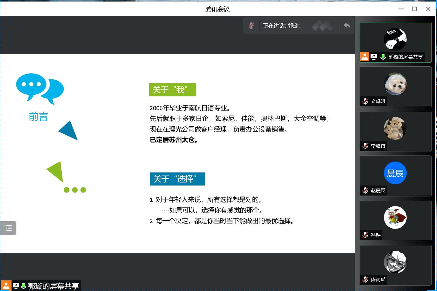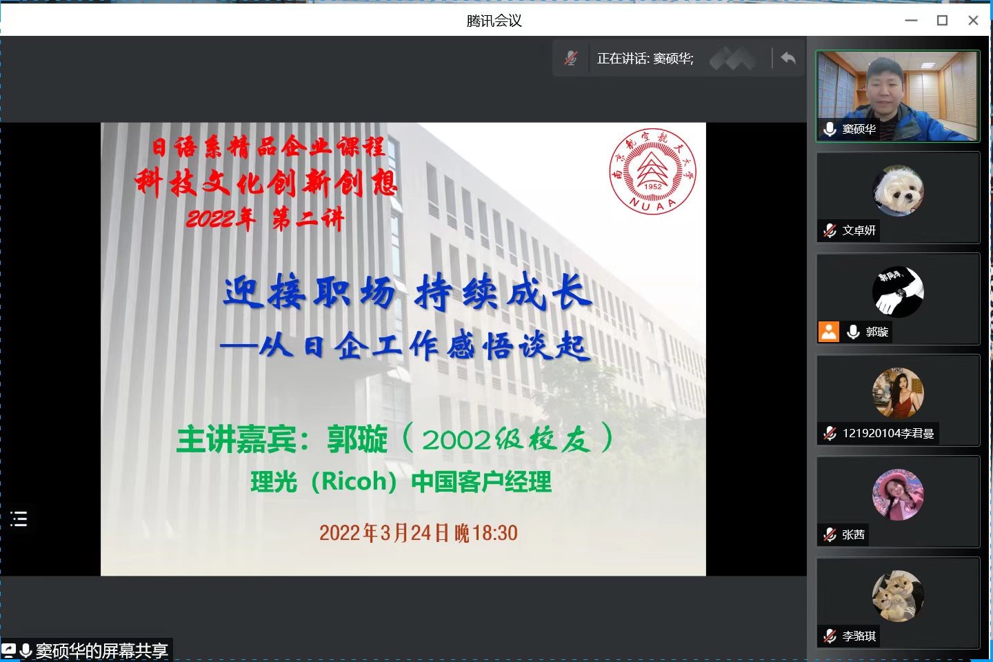3月24日下午6:30,亚洲色情 日语系科技文化创新创想课程2022年度第二讲通过腾讯会议成功进行,主题为《迎接职场,持续成长——从日企工作感悟谈起》。主讲嘉宾为日语系02级校友郭璇,现任理光(Ricoh)中国客户经理。