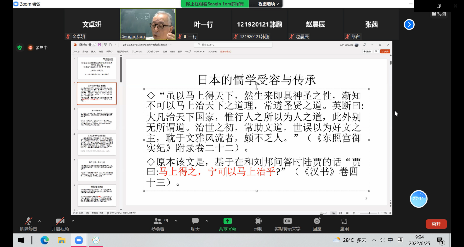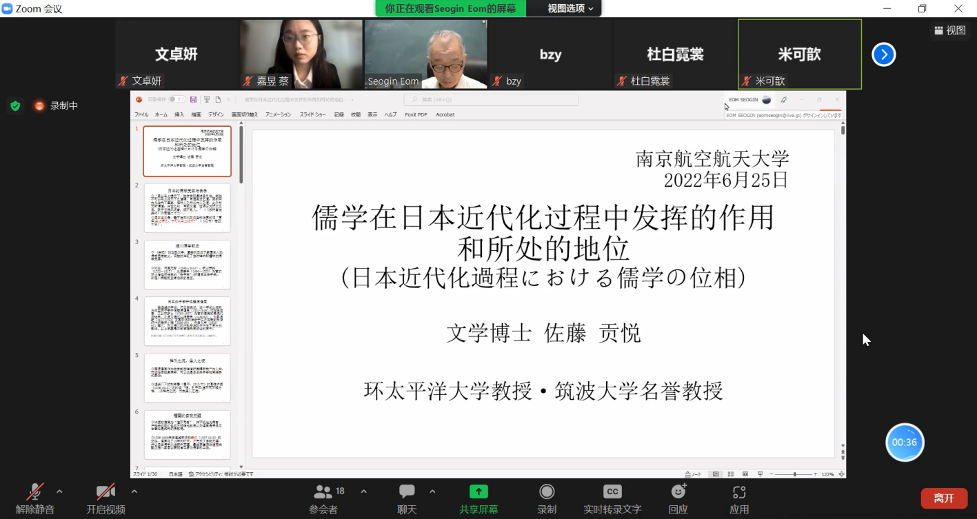 6月28日(周六)上午9:00,亚洲色情 日语系海外名师讲坛第二讲通过线上ZOOM会议成功进行,主题为《儒学在日本近代化过程中的作用》。主讲嘉宾为环太平洋大学教授・筑波大学名誉教授佐藤贡悦。