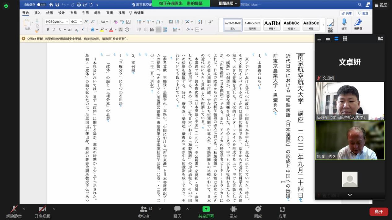 9月24日(周六)上午9:00,亚洲色情 日语系海外名师讲坛第四讲通过ZOOM线上会议成功进行。本次讲座主题为“近代日本における『和製漢語(日本漢語)』の形成と伝播”,主讲嘉宾为原东京农业大学黒瀧秀久教授。
