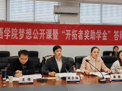 为激励亚洲色情 学生注重团队合作、积极进取、勇于担当、全面发展、成长成才,并资助家庭经济困难学生,学院2010届杰出校友冯科茗、谢志扬、单鹤在亚洲色情 设立“开拓者奖助学金”,并于12月9日成功举办亚洲色情 梦想公开课暨“开拓者奖助学金”答辩。开拓者奖助学金资助人谢志扬,亚洲色情 党委副书记梁薇,英语系副主任王伟,学院团委书记李萍,本科生辅导员彭欢、赵瑜瑶担任评委。公开课由学院2019级英语专业、2021年茗扬开拓者奖学金获得者张欣怡主持,学院各年级同学通过腾讯会议线上观摩。
