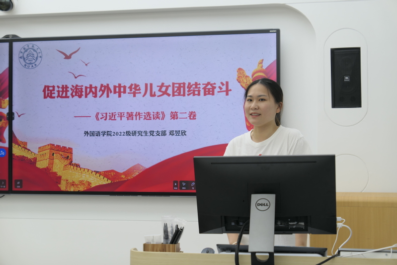 亚洲色情 2022级研究生党支部书记邓昱欣领学《习近平著作选读》第二卷“促进海内外中华儿女团结奋斗”,并结合自身在江苏发展大会上的志愿服务经历,以及过程中帮助参会嘉宾中国旅美律师协会会长申春平的故事,讲述了海内外中华儿女的家国情怀,阐述了新时代爱国统一战线的丰富内涵和时代价值。