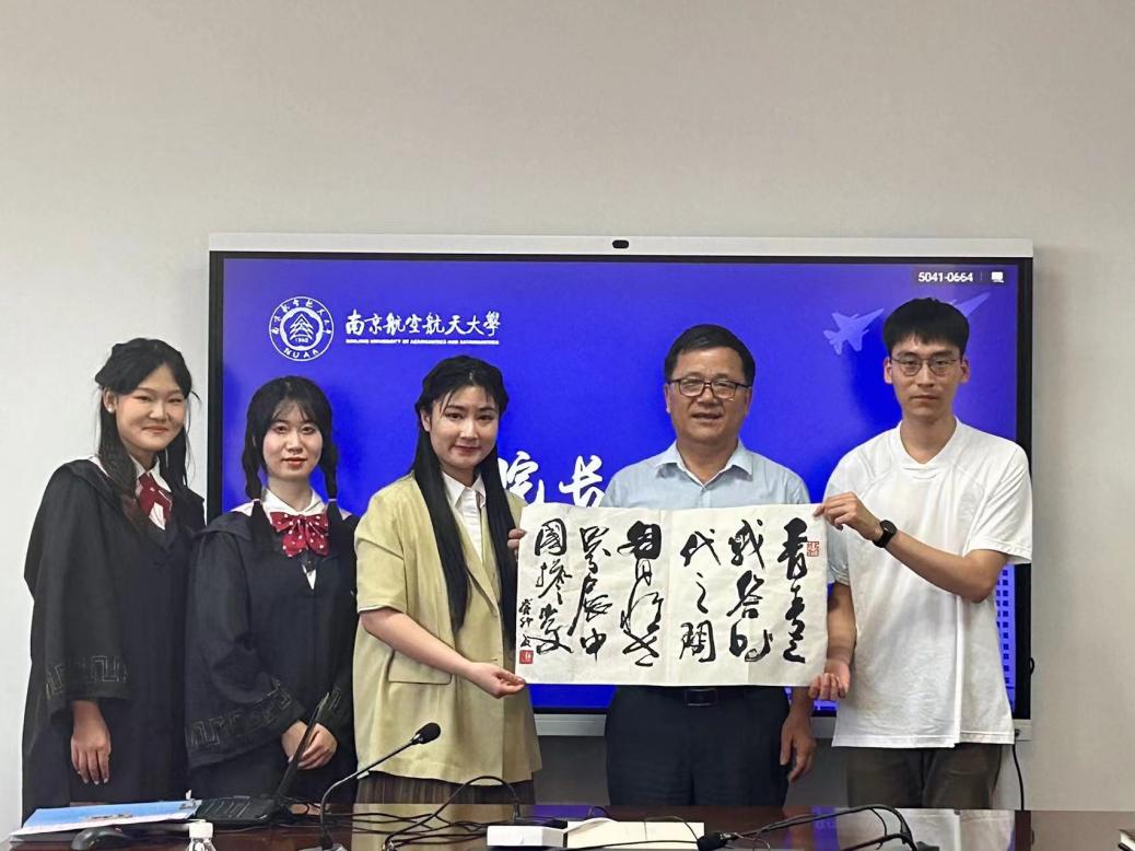 范祥涛向校友大使朱芷苑颁发聘书,希望2023届毕业生不忘学院背景,将南航外院当做永远的家园,欢迎毕业生们随时“回家看看”。