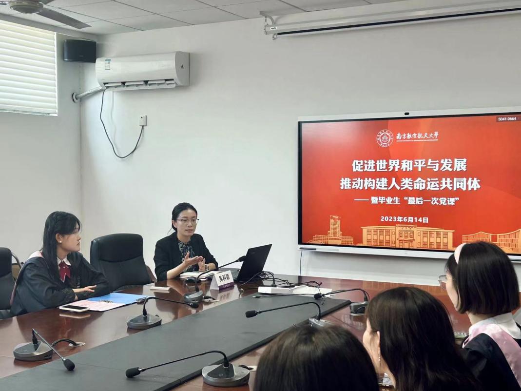 座谈会结束后,院党委副书记吴科颖以“促进世界和平与发展,推动构建人类命运共同体”为主题,为毕业生党支部讲授“最后一次党课”。吴科颖带领支部成员细致回顾了习近平外交思想的发展历程,并根据《习近平新时代中国特色社会主义思想专题摘编》中的有关内容,结合语言专业特色,进行深层解读。她还结合世界贸易组织首位中国辩护律师彭俊的例子以及近期走访企业的所思所感,寄语毕业班党员,以语言专业为背景,探索多元化发展道路,成长为祖国发展需要的具有国际视野的复合型人才,并诚挚邀请毕业班党员继续关注、参与南航外院的发展建设,贡献自己的青春力量。