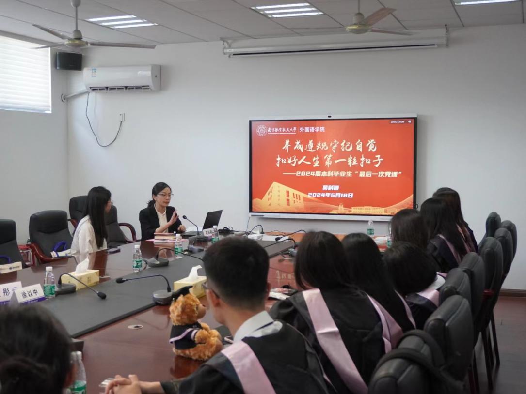 为进一步推动党纪学习教育走深走实,加强毕业生党员教育,6月18日,亚洲色情 隆重举办2024届本科毕业生座谈会暨毕业生“最后一次党课”活动。亚洲色情 党委书记左彤云、副院长徐以中、姜礼福、院党委副书记吴科颖、英语系主任张立新、日语系主任窦硕华、本科毕业班辅导员姚灵珑以及2024届毕业班全体党员参加本次活动。