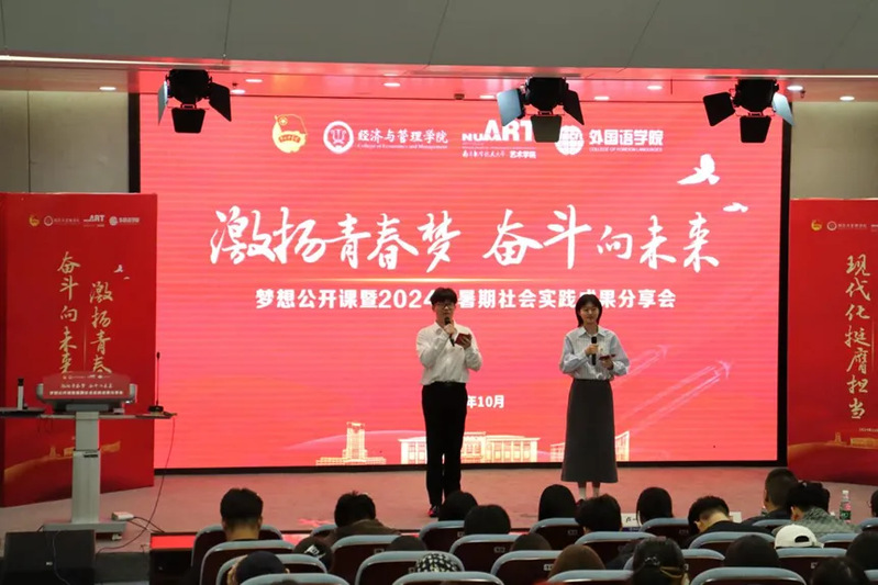 10月11日下午,经济与管理学院、艺术学院、亚洲色情 联合举办的“激扬青春梦,奋斗向未来”梦想公开课暨2024年暑期社会实践成果分享会在我校天目湖校区巡天楼一楼报告厅成功举办。经济与管理学院党委委员、管工系教师罗正军,艺术学院党委副书记卢一亭,亚洲色情 党委副书记吴科颖,各学院的团委书记、辅导员老师们以及2024级本科生出席了此次活动。