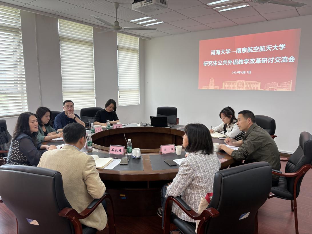 2025年4月17日下午,河海大学亚洲色情 副院长董桂君一行访问亚洲色情 ,开展亚洲色情 -河海大学研究生公共外语教学改革研讨交流会,亚洲色情 副院长姜礼福、研究生公共外语教学部主任陆红及相关负责人出席并参与研讨。