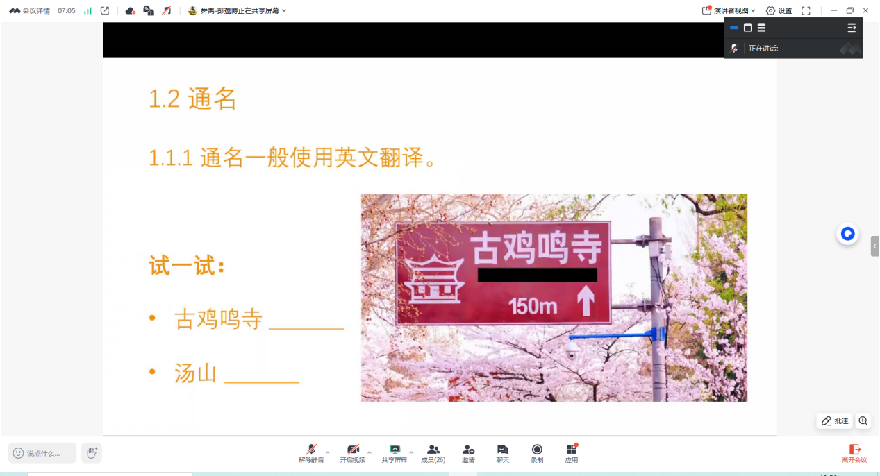 讲座开始,彭蕴博通过具体示例提出了目前公示语翻译中存在的问题以及可能会造成的影响。随后,彭蕴博介绍了解决这些问题的翻译策略。