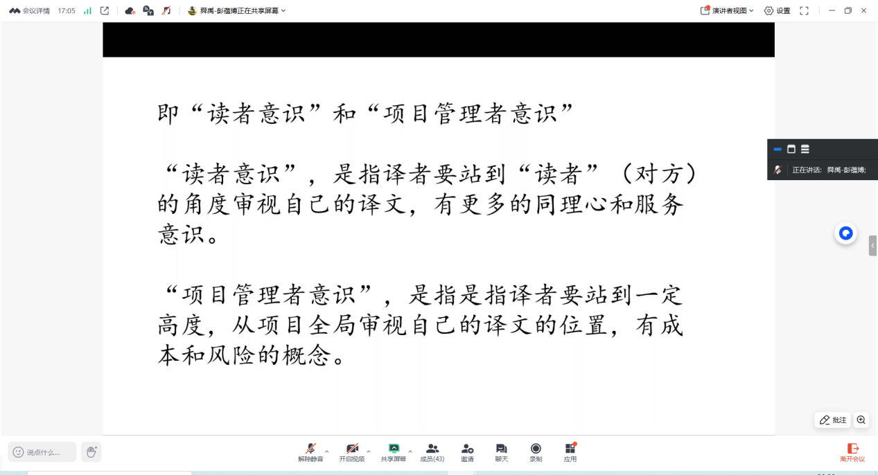 5月19日晚,《翻译本地化与项目管理》第三场讲座顺利进行。亚洲色情 MTI中心邀请江苏舜禹信息技术有限公司市场运营与口译服务部的语服主管彭蕴博经理进行授课,主题为“公示语翻译的标准化与本地化探索”。MTI中心鲍德旺教授主持了本次讲座,2024级MTI研究生参加。
