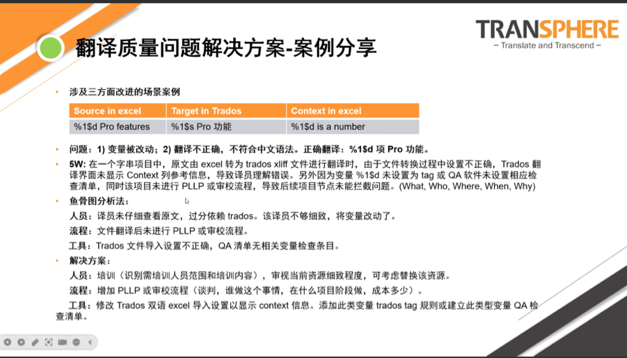5月23日,舜禹环球通资源管理部副经理苏雪美女士作题为“翻译质量管理”的讲座。苏经理辨析了本地化与翻译的差异,系统梳理了TEP流程、QA标准及LQA规范,并解析项目管理五大阶段的质量控制要点。她提出“双维度”质量评估体系(错误类型与严重程度)及“四维改进框架”(原理-人员-流程-工具),结合PDCA循环与根因分析法,演示了技术文档的本地化应用。最后,她展望人机协同趋势,建议译者立足“技术型人才”与“专业审校”双轨发展,以应对行业变革。