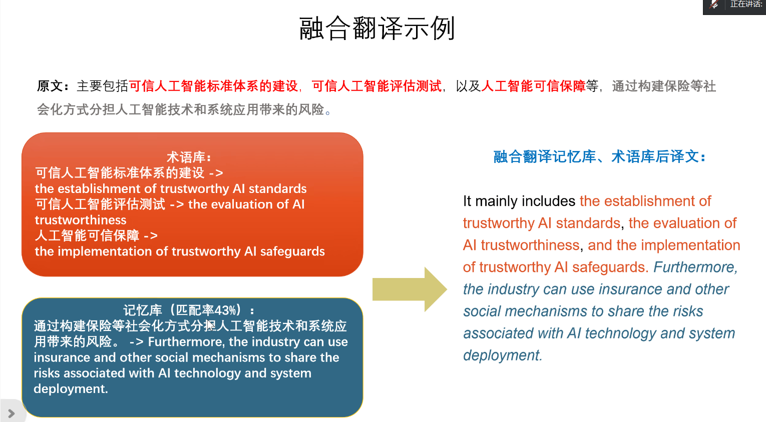 接着,王文静详细介绍了大语言模型在YiCAT中的应用,包括大模型机器翻译、融合翻译、术语干预、自动译后编辑和AI助手等功能,此外,还探讨了基于DeepSeek的翻译融合应用,展示了其在理解上下文和产出高质量翻译文方面的优势,并强调了融合翻译效果最优。